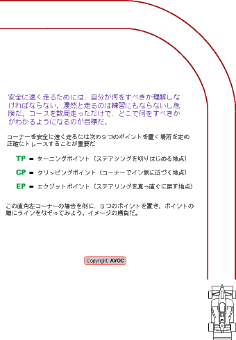 一番簡単な直角コーナーを例に、3つのポイントをどこに置くか考えてみてくれたまえ。同じアウトインアウトのラインでも、サーキットを速く走るためのラインとひとつのコーナーを速く回るためのラインの二つがあることを覚えておくように。