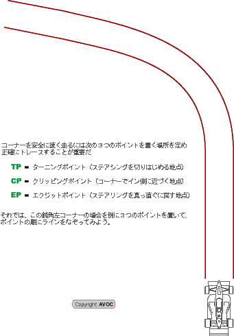 サーキットにはいろいろなコーナーがある。下の図は左鈍角コーナーを模したものだ。ここでもどこに3つのポイントを置くか考えてみよう。置く場合に注意しなければならないのは、アウトインアウトのラインにはひとつのコーナーを速く回るラインとサーキット一周を速く走るラインがあることだ。