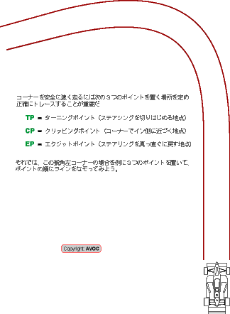 サーキットにはいろいろなコーナーがある。下の図は左鋭角コーナーを模したものだ。ここでもどこに3つのポイントを置くか考えてみよう。置く場合に注意しなければならないのは、アウトインアウトのラインにはひとつのコーナーを速く回るラインとサーキット一周を速く走るラインがあることだ。