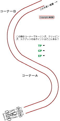 | サーキットにはいろいろなコーナーがある。単純なコーナーばかりとは限らない。半径の小さいコーナーや大きなコーナー。長いコーナーや短いコーナー。後に長い直線を控えるコーナーや手前に長い直線のあるコーナー。ひとつひとつのコーナーに対してアウトインアウトのラインをあてはめるのは当然だが、中には「サーキット一周を速く走るため」にラインをモディファイしなければならない場合もある。下の図はそんなコーナーのひとつ、S字角コーナーだ。どこに3つのポイントを置くか考えてみよう。置く場合に注意しなければならないのは、アウトインアウトのラインにはほとつのコーナーを速く回るラインとサーキット一周を速く走るラインがあることだ。