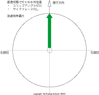 図の矢印はクルマの進む方向を示している。矢印が円周に届いているから、今まさにタイヤのグリップの100%を使って加速している状態にある。