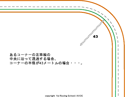 先ほどのコーナーを回る。左車線の真ん中をトレースして走行した場合、その半径が43mとする。さして大きくないコーナーだ。2速では回転が上がり過ぎ、3速では加速が鈍く思える。そんなコーナーだ。