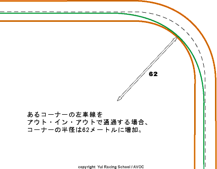 ここは公道。まかり間違っても対向車線にはみ出して走行してはいけない。そこで左車線だけを使ってアウトインアウトのラインで走ってみる。ラインをモディファイしたことによって半径が62mに拡大した。