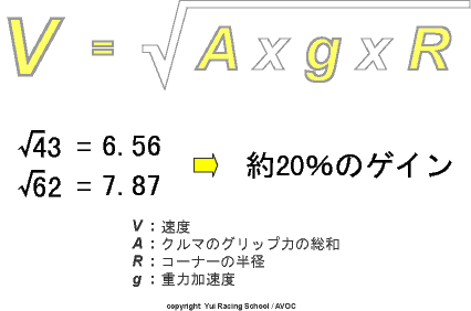 つまり、あのコーナーを限界で走っていたとすると左車線でアウトインアウトのラインを通るだけで20%速度が増加する。同じグリップのタイヤを履きサスペンションを固めなくても20%速くコーナーを廻れることになる。