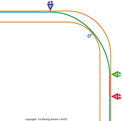 下の図で言えばターンインポイントまでクルマは直線運動をし、エクジットポイントから再び直線運動をする。ターンインポイントからエクジットポイントまでがコーナリング。図ではひとつの大きなアークでコーナリングしている。